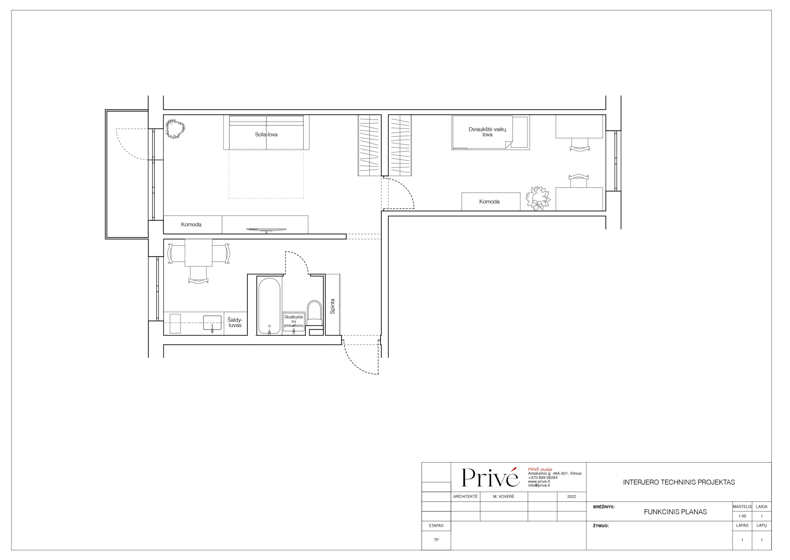 Atskiri kambariai – praktiškesnis pasirinkimas jaunai šeimai su vaikais, nuomai butą ruošiantiems savininkams ar tiesiog tiems, kurie nenori virtuvės svetainėje. Šis baldų planas – paprastas, bet funkcionalus.