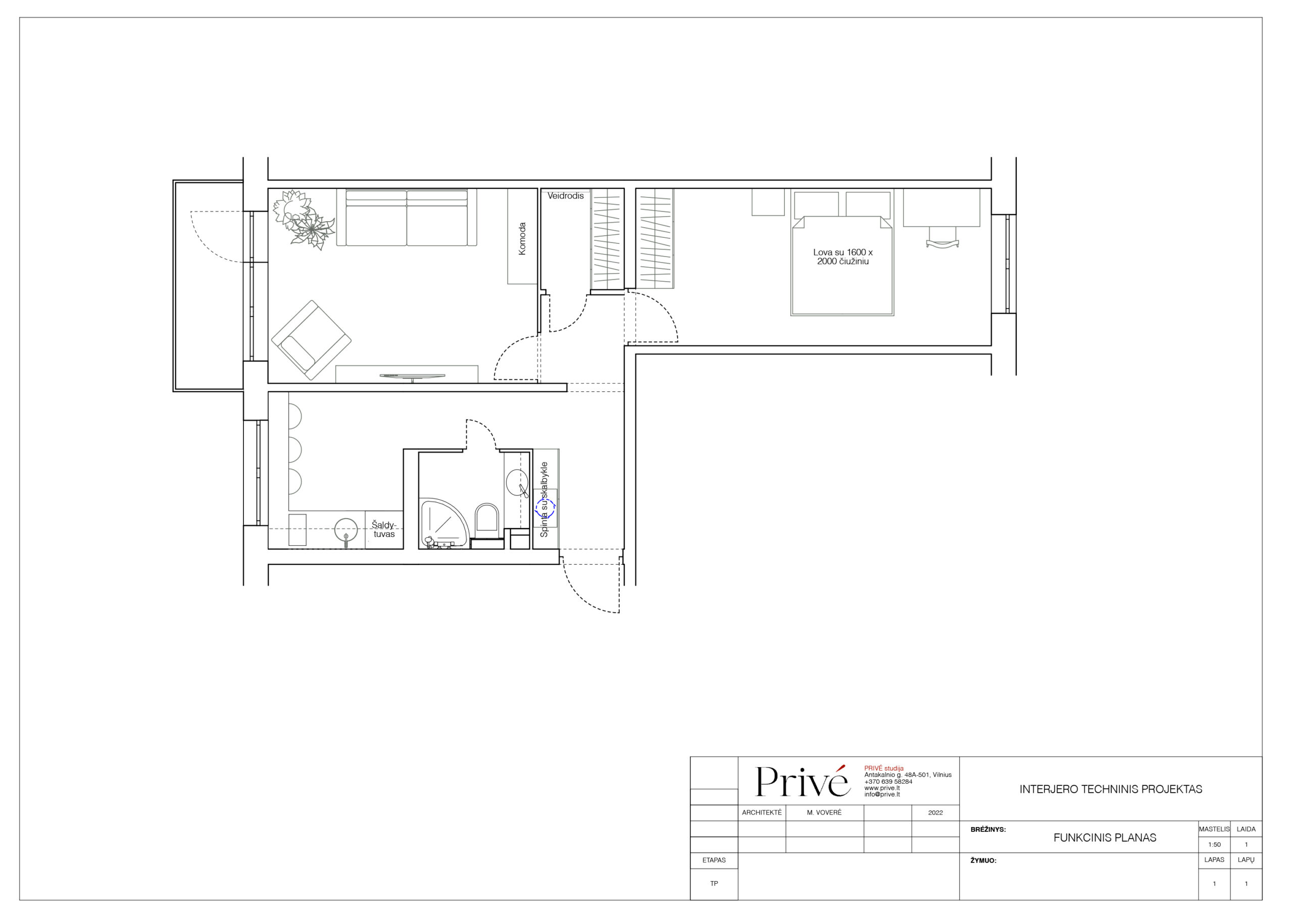 Šiuolaikiškas buto planas: miegamasis ir bendra erdvė