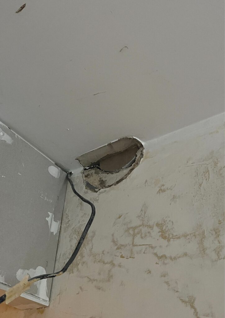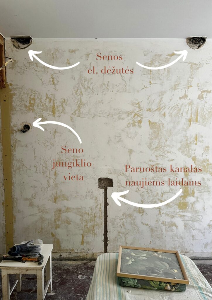 Renovacijos projektams būdinga tai, kad visada gali būti kažkuo nustebintas. Šiame bute Žirmūnuose mus nustebino senieji elektros laidai, o tiksliau – jų vieta. Įprastai visi laidai privalo būti vedami tik horizontaliai arba vertikaliai. Tai leidžia užtikrinti, kad vėliau, sugalvoję kažką pritvirtinti prie sienų, jūs visada galėsite nuspėti laidų vietą, nepataikysite į juos grąžtu ir išvengsite didelių problemų. Pasirodo, visi kabeliai šiame bute buvo nutiesti įstrižai! Tiek lubose, tiek sienose! Laimė, kad mano seneliai, tiek metų čia gyvendami, niekada kabindami paveikslą į juos nepataikė!