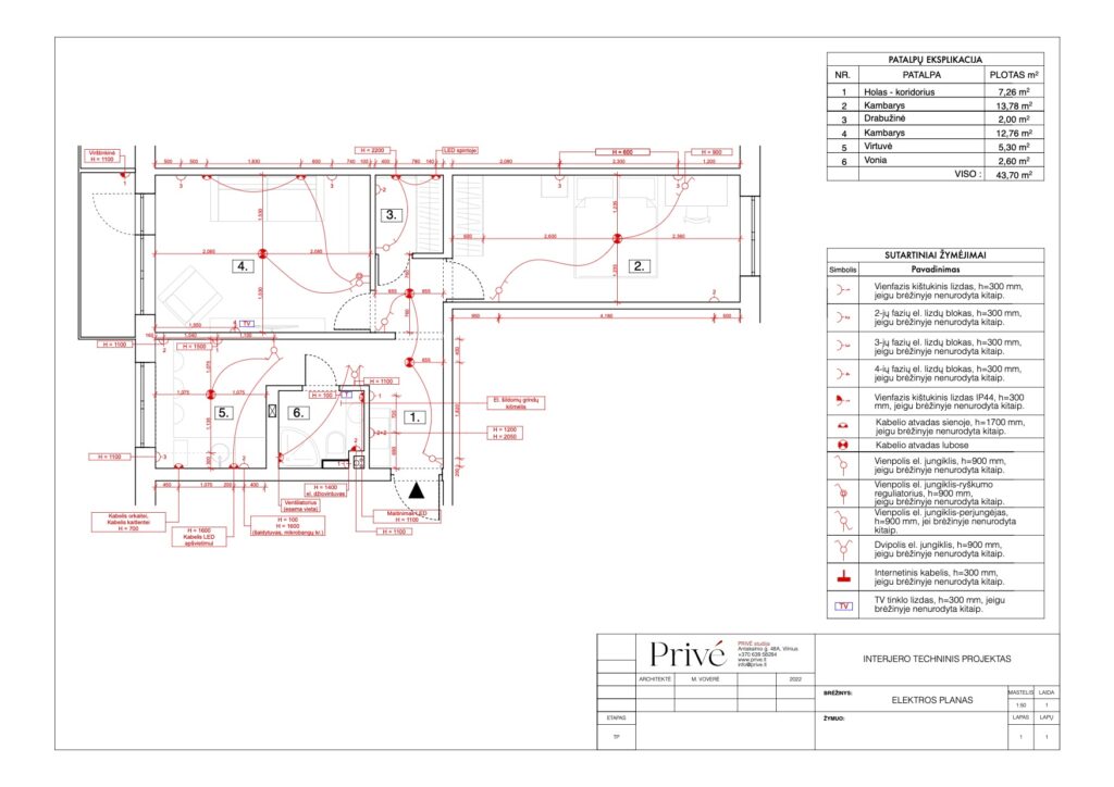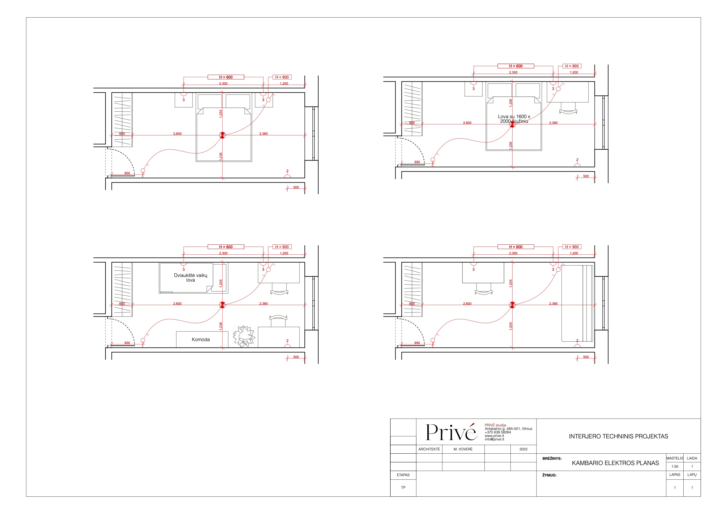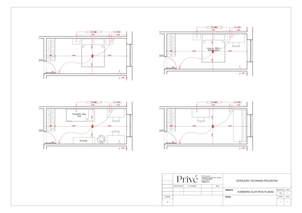 Šio buto apšvietimą bei elektros taškus planavau turėdama omenyje, kad būstas bus nuomojamas. Nežinau, ar jame gyvens du žmonės, ar šeima su vaikais, taip pat nežinau, kaip bus apstatytas mažesnysis kambarys. Baldai gali būti išdėstyti bent keturiais variantais, o jungiklius ir rozetes planavau taip, kad tiktų visais atvejais.