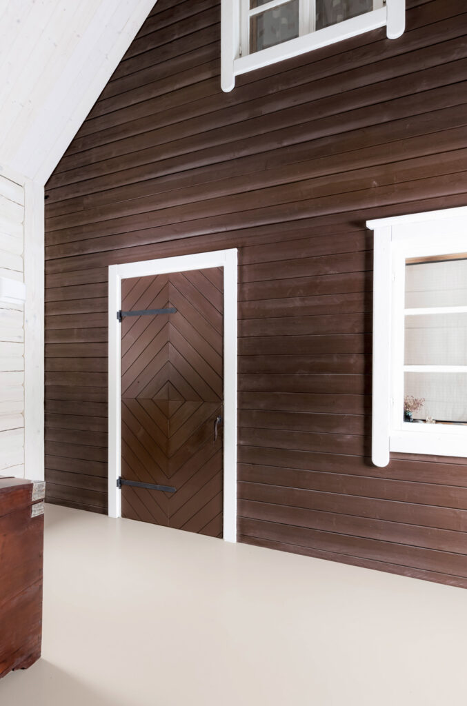 Šešių metrų aukščio holas, kurio viena iš sienų – senosios trobos fasadas, sujungia architektūrą, kurią skiria dešimtmečiai. Lieto smėlio spalvos betono grindys ir balinti rastai tampa fonu tamsiam senosios trobos fasadui.