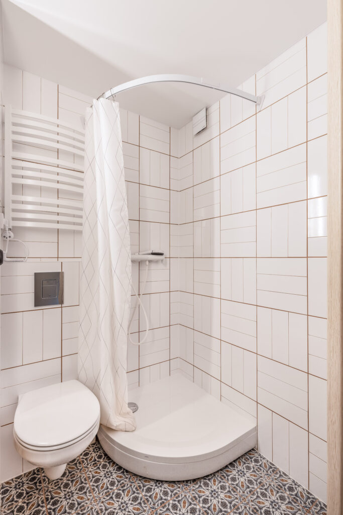 Santechnika senos statybos bute yra ta vieta, kur dideli norai susiduria su realybe, ir kur tenka susitaikyti su tuo, kad nemažai gerų/patogių/stilingų sprendimų įgyvendinti nepavyks. Taip nutiko ir su dušo padėklu. Nors iš plytelių suformuotas ir grindų lygyje esantis dušas (be jokių slenkstukų!) yra idealiausias sprendimas, santechnikui apžiūrėjus patalpą teko pripažinti, kad to padaryti nepavyks. Bute gylis iki perdangos yra per mažas, kad pavyktų suformuoti pakankamą nuolydį vandeniui nutekėti ir dušo latakui įleisti.
